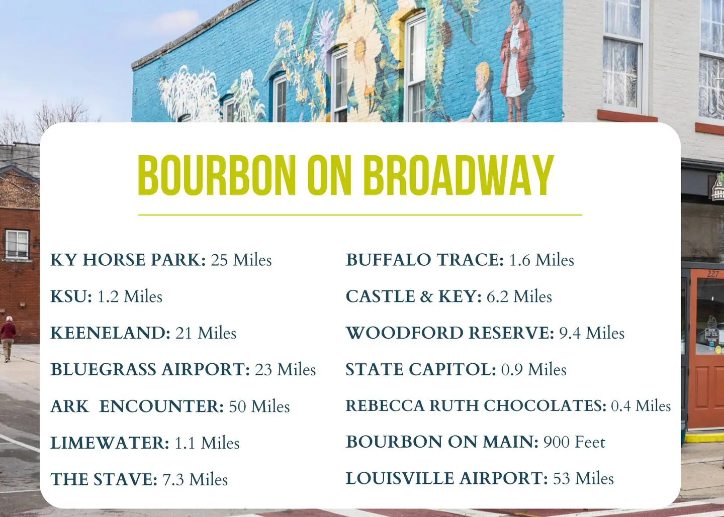 Located in the heart of downtown Frankfort above Brown Barrel.Bring your own vehicle to make the most of exploring Central Kentucky’s iconic bourbon distilleries, scenic byways, and hidden gems—many are just a short drive away. When you’re ready to slow down, park with ease and enjoy the charm of downtown Frankfort on foot, with shops, restaurants, and historic landmarks all within walking distance.