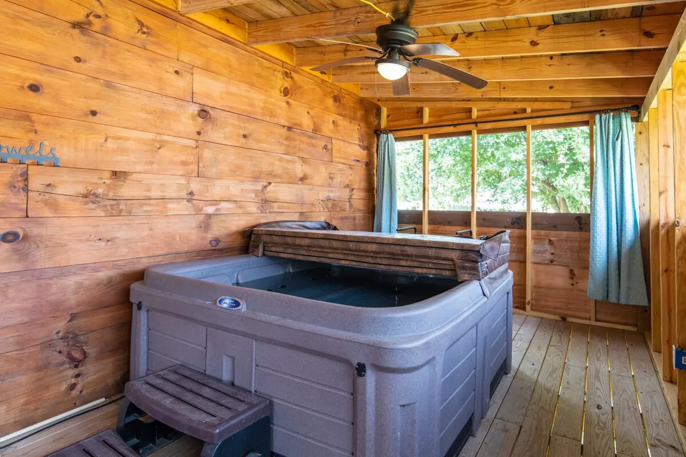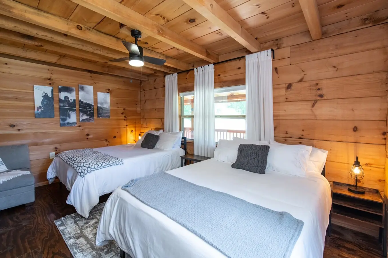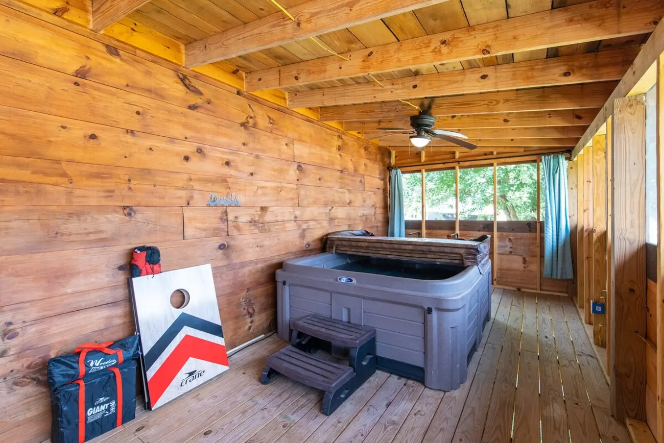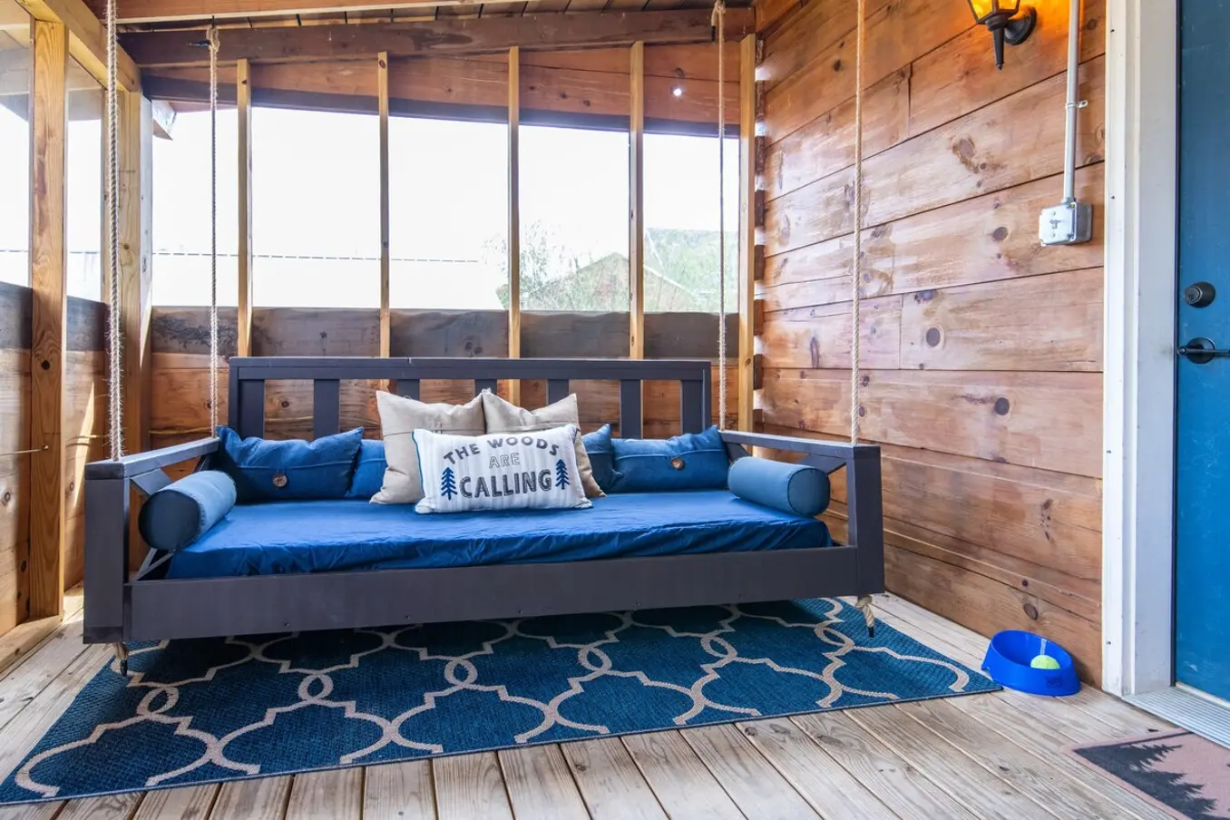 Some of our favorite features about Red River Junction are the exterior amenities. Our cabin has a large front porch with a swing and rocking chairs. Around back, Red River Junction features a screened in porch with bed swing, bar area, hot tub, and so much more! Our fully fenced in yard features a charcoal grill, firepit and outdoor shower.