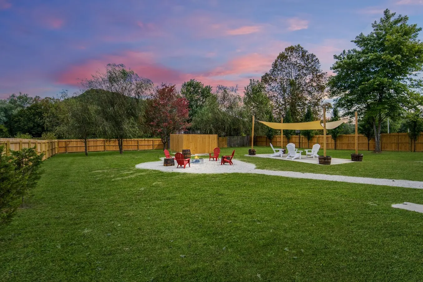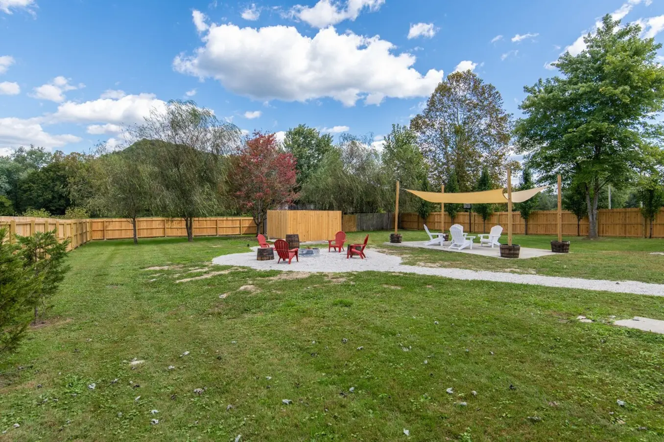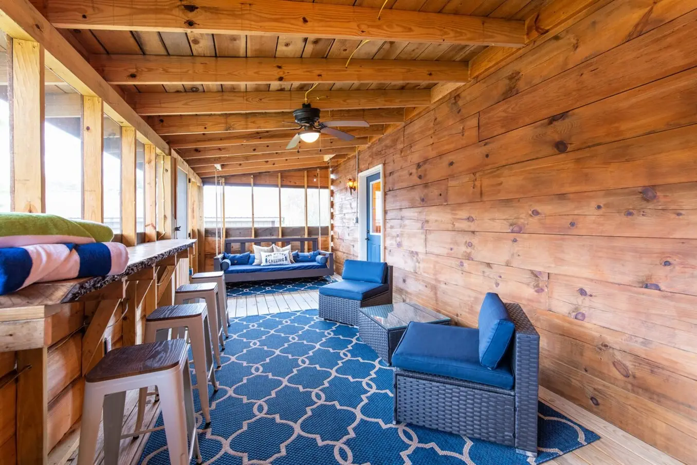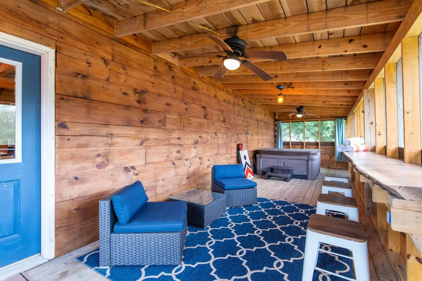 Some of our favorite features about Red River Junction are the exterior amenities. Our cabin has a large front porch with a swing and rocking chairs. Around back, Red River Junction features a screened in porch with bed swing, bar area, hot tub, and so much more! Our fully fenced in yard features a charcoal grill, firepit and outdoor shower.