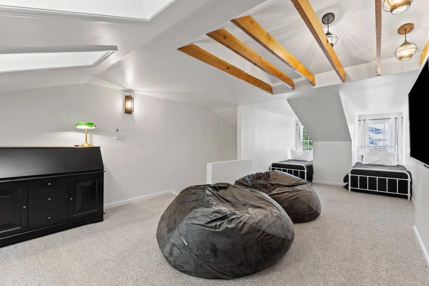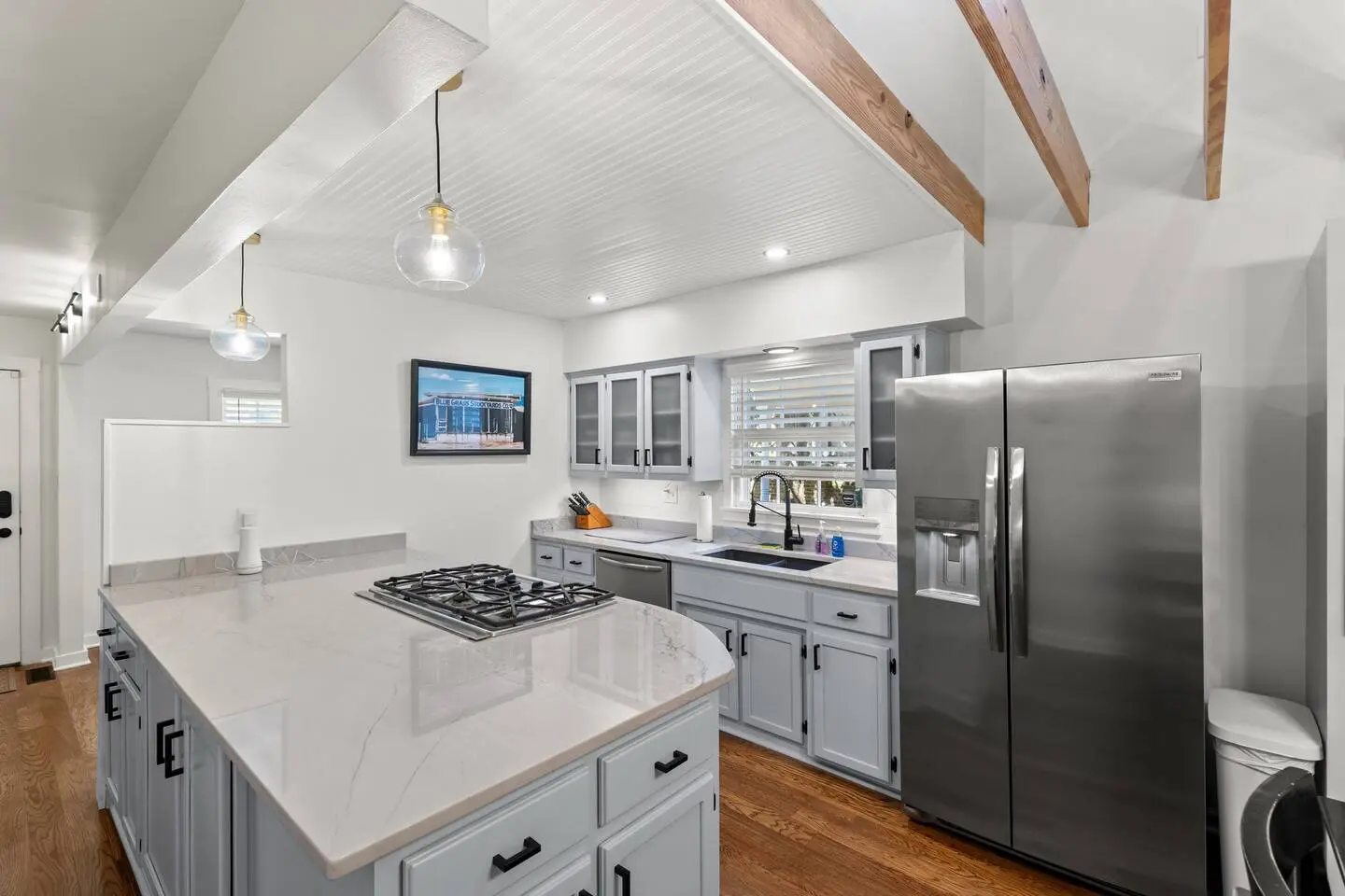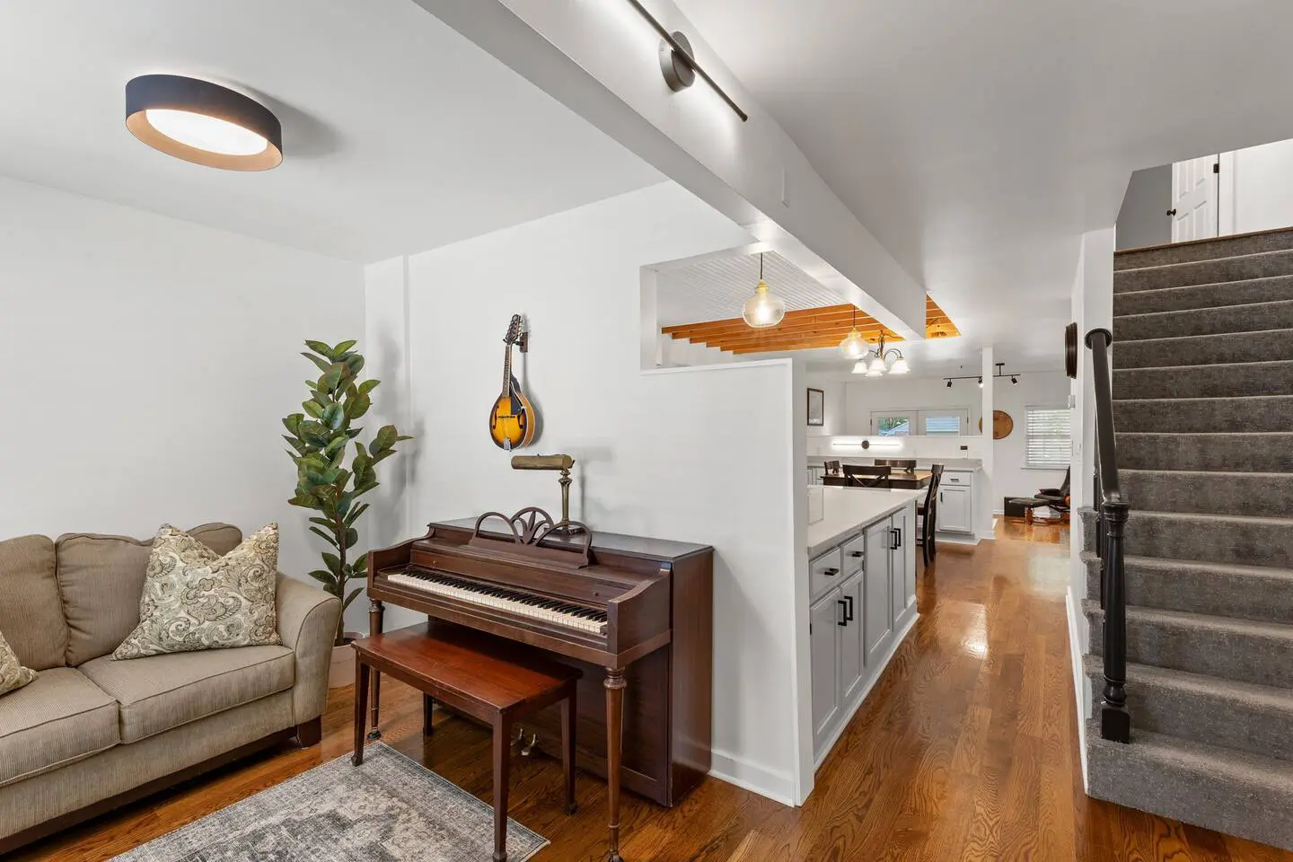 The house is setup as follows: Upon entering, guests will be greeted by our sitting room featuring a Love Seat & Upright Piano. Guests will continue on to our updated kitchen featuring stainless steel appliances, quartz countertops, and dining table for 6. Our kitchen opens onto our sunken living room with a sectional.
