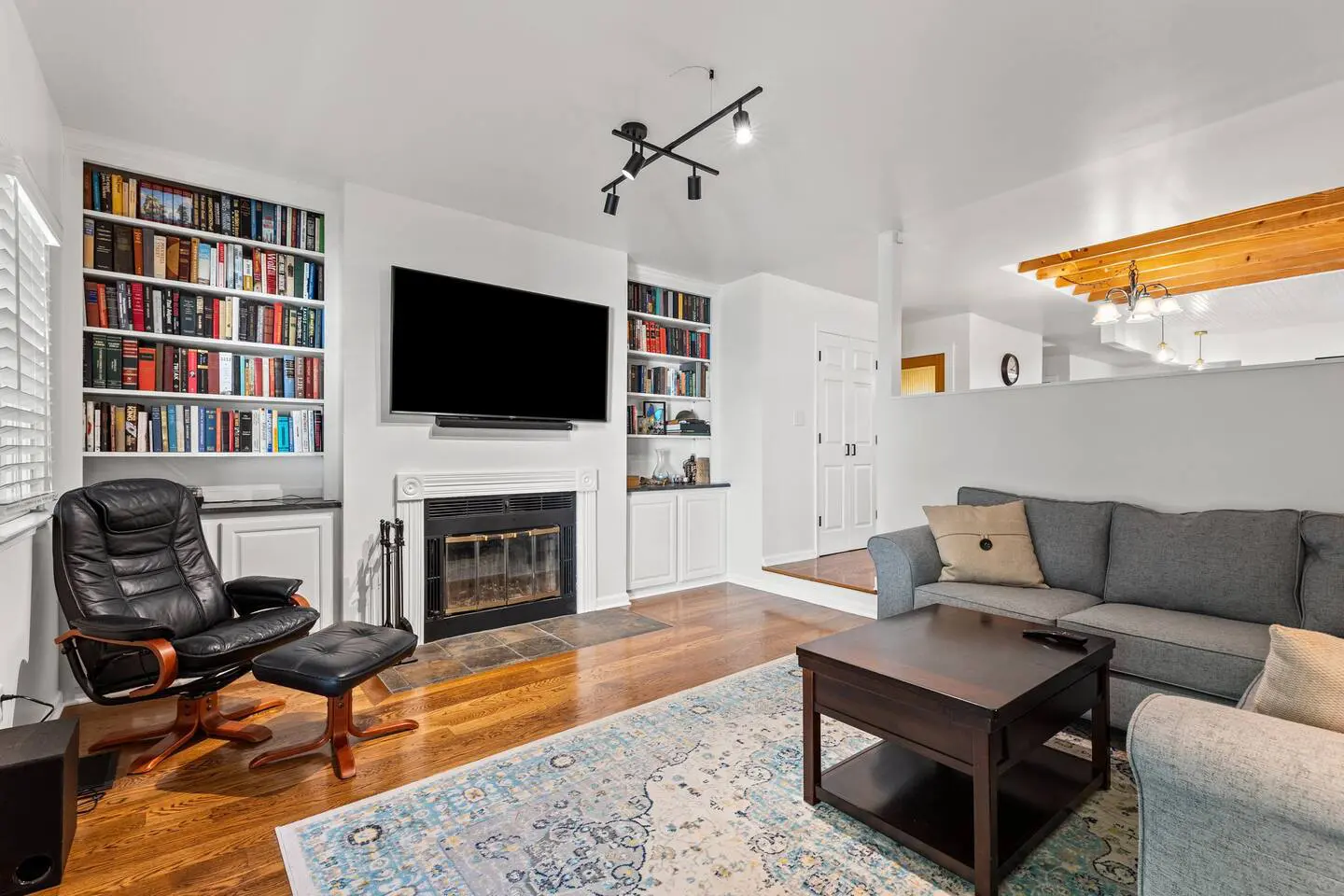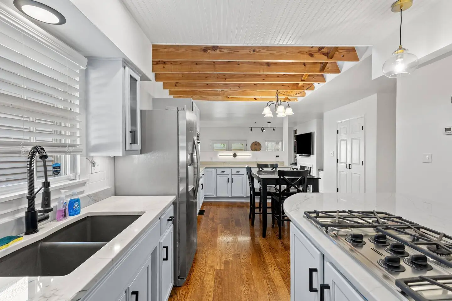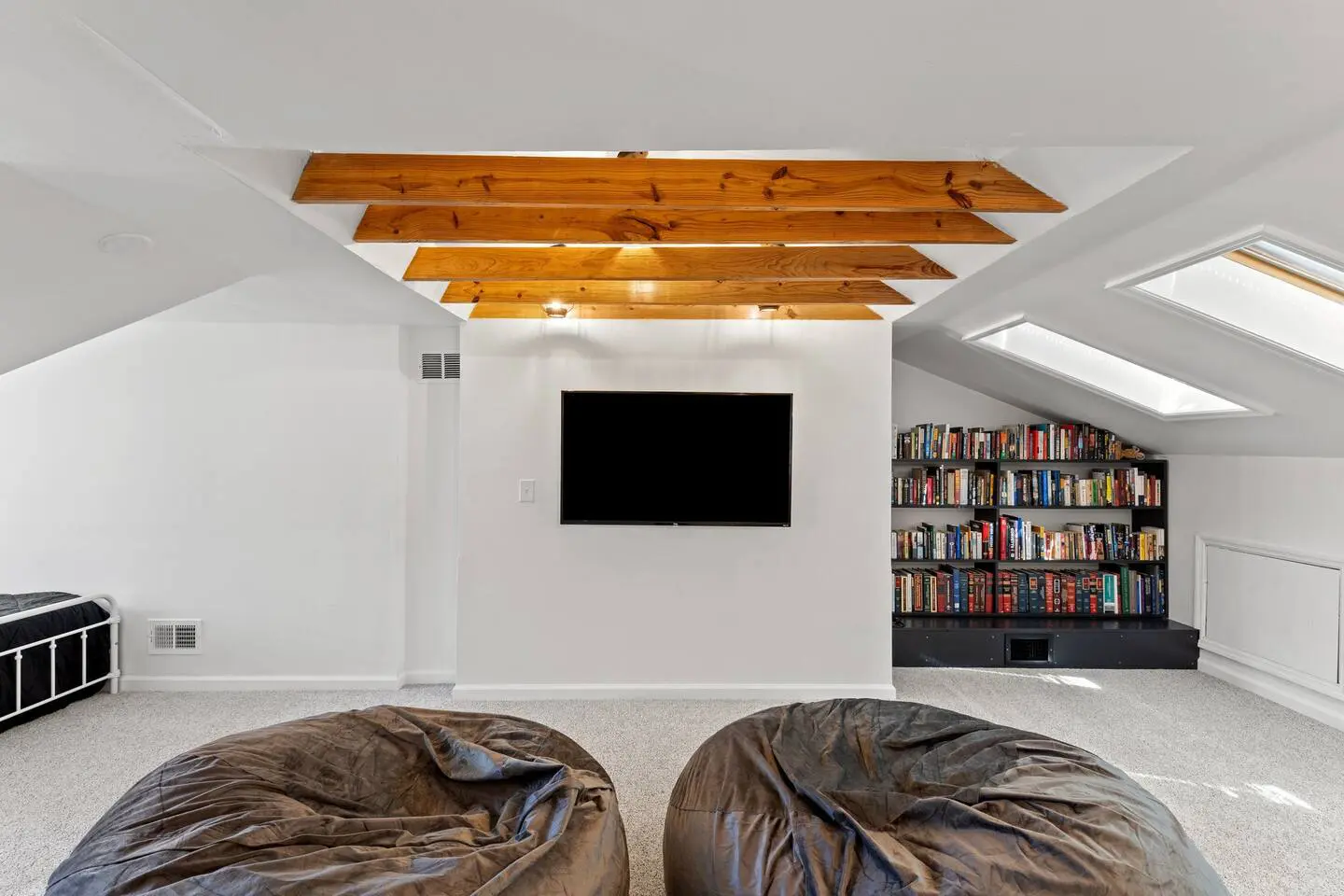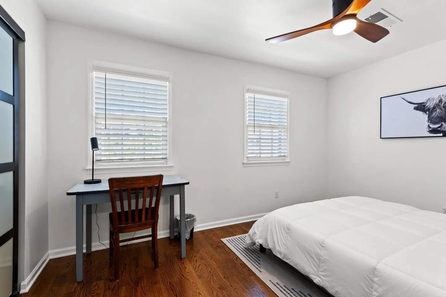 The house is setup as follows: Upon entering, guests will be greeted by our sitting room featuring a Love Seat & Upright Piano. Guests will continue on to our updated kitchen featuring stainless steel appliances, quartz countertops, and dining table for 6. Our kitchen opens onto our sunken living room with a sectional.