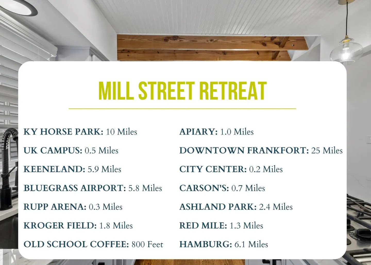 Located in historic S Mill Neighborhood, guests will be surrounded by some of Lexington’s most desirable Historical properties while being walking distance to all that Lexington has to offer.