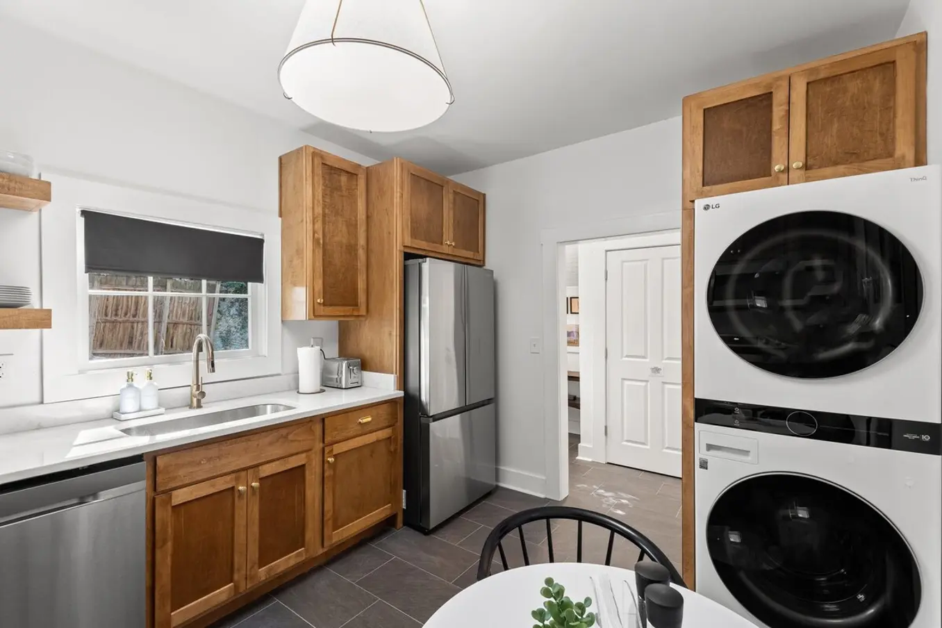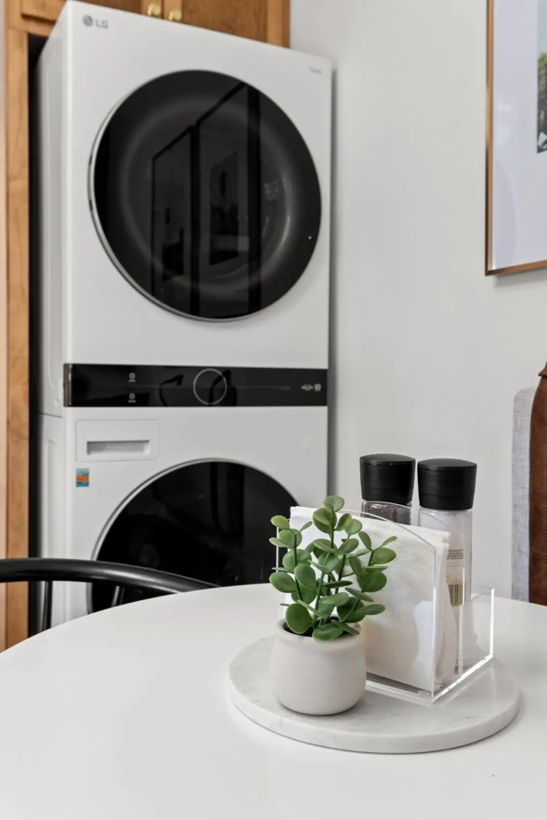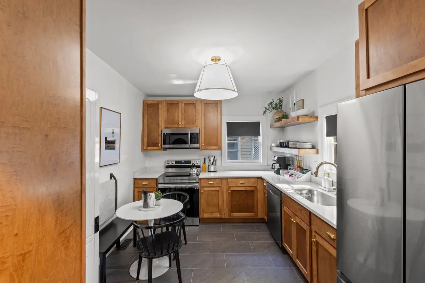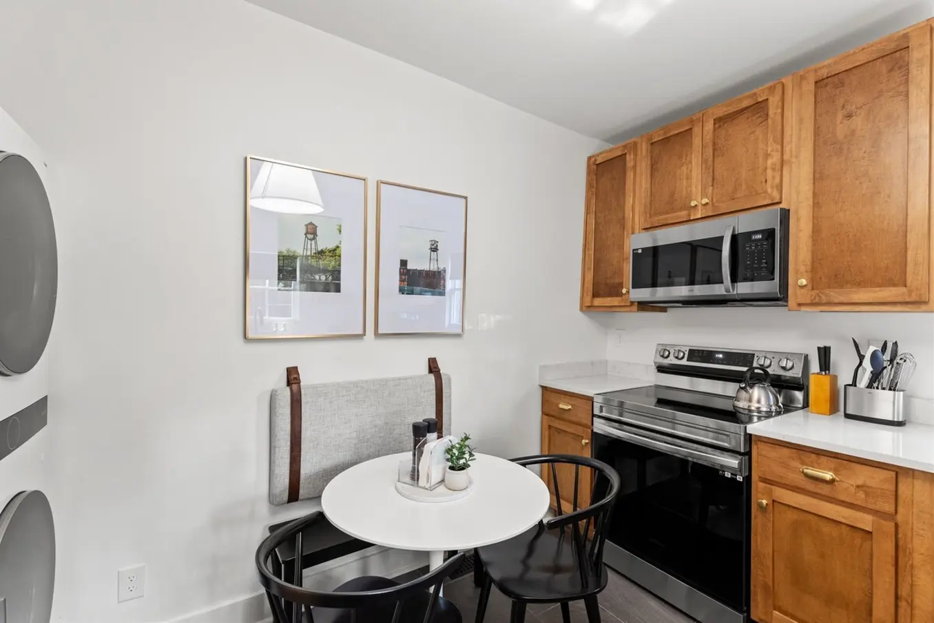 Our dining table is located in the kitchen and seats 4 guests. You can enjoy cooking in our newly renovated kitchen with quartz counters, brand NEW stainless appliances, and all the utensils needed to prepare your favorite dishes. We have well equipped our kitchen for all of your culinary needs.