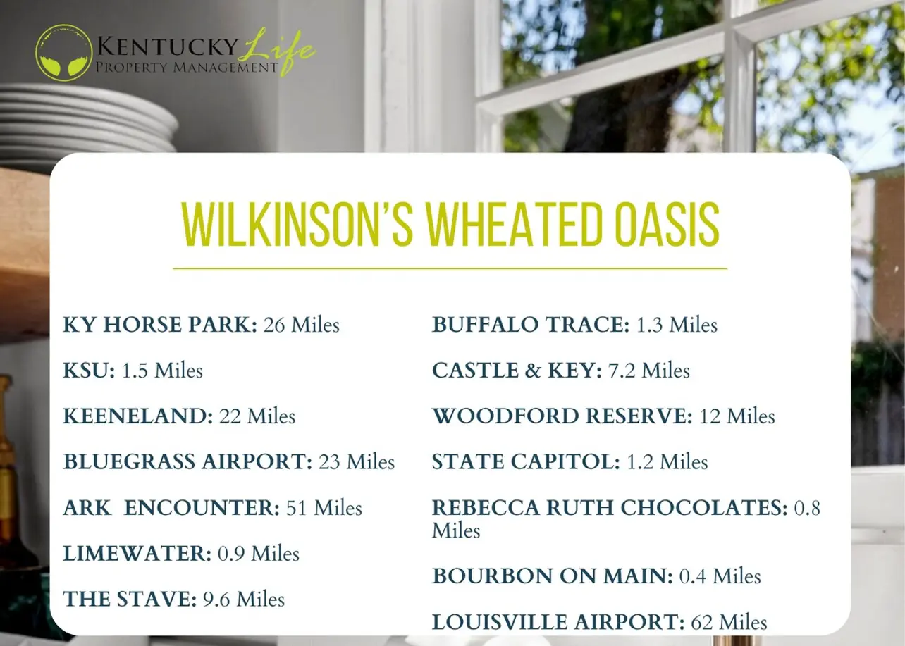 Wilkinson’s Wheated Oasis has plenty of room for your friends & family to gather while visiting historic Frankfort, Kentucky! This charming home has a single floor layout, please refer to our floorplan in our photos. Our home has a private living room, newly renovated kitchen, 2 private bedrooms, 2 spacious bathrooms, & a charming front porch. You will have no problem finding somewhere to spend your time together or alone while staying with us.